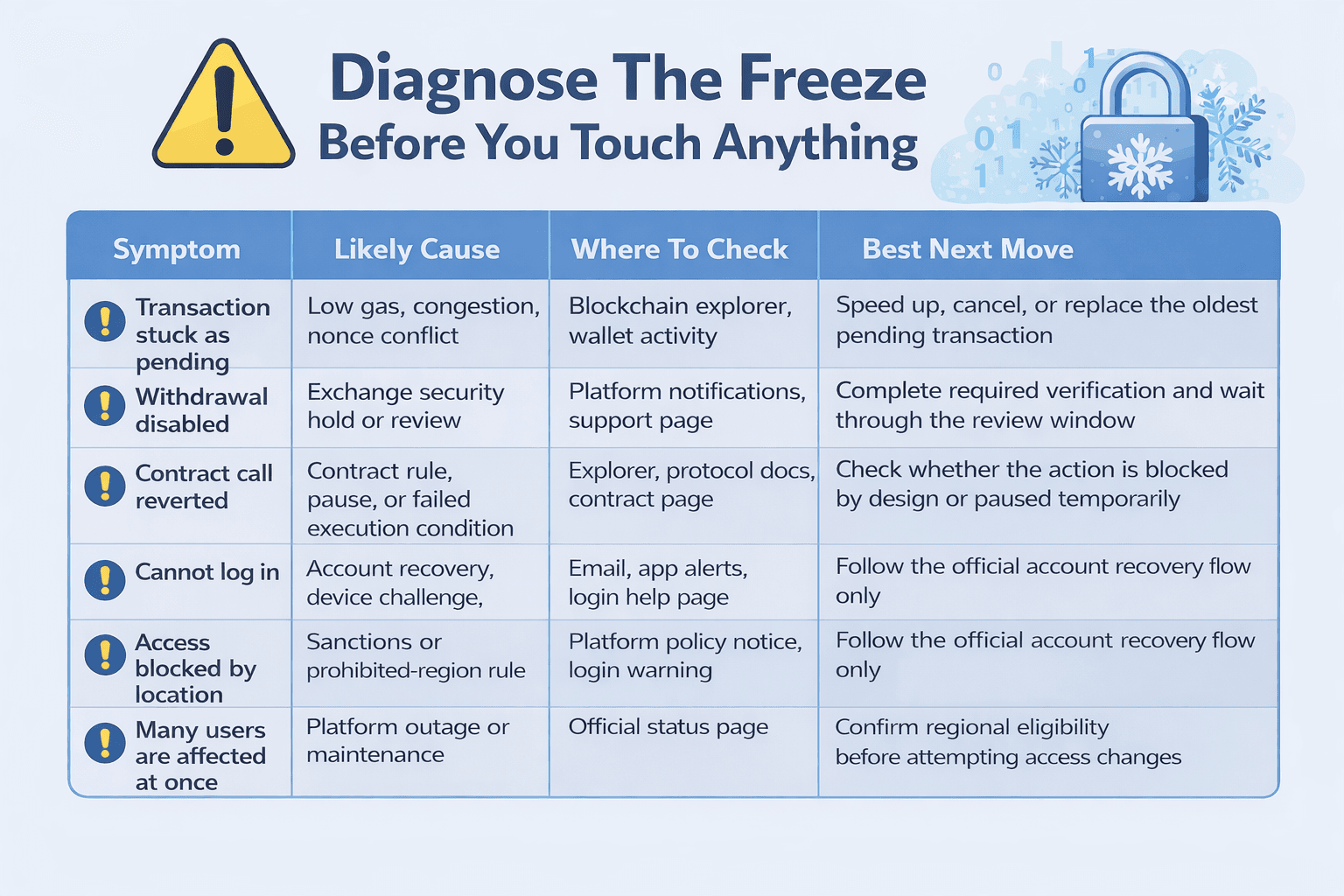 The bigger takeaway is simple. Crypto does not freeze for one reason. It freezes when some layer of the stack stops trusting the action in front of it, whether that layer is an exchange, a wallet transaction queue, a smart contract, or a compliance system. Once you understand that pattern, the whole topic gets less dramatic and much easier to handle. You stop guessing, stop panicking, and start diagnosing.