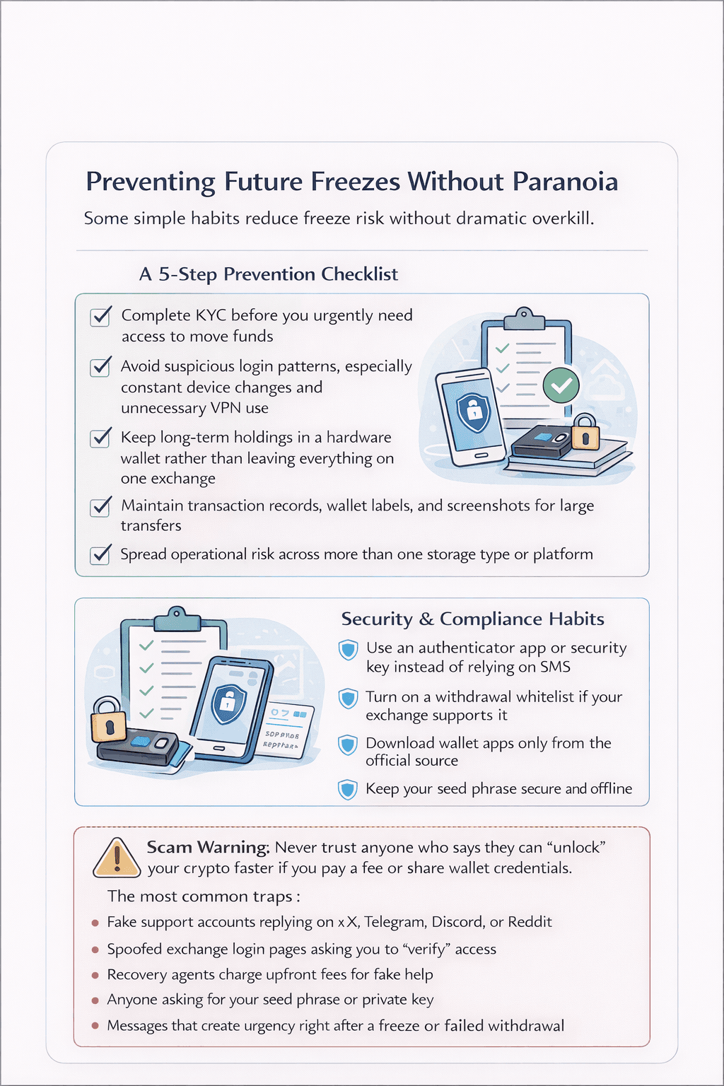 Smarter Habits That Lower Freeze Risk Over TimeThe best prevention habits do not come from treating every crypto action like a spy operation. They come from reducing avoidable friction at the points where freezes usually start: identity checks, login behavior, withdrawal security, and poor recordkeeping. Most exchange freezes are triggered by an inconsistency. Most wallet problems are made worse by weak backups or sloppy device hygiene. The goal is not to become obsessive. It is to remove the obvious reasons a platform, wallet, or protocol would stop trusting the action in front of it. Coinbase’s 2-step verification guide and Binance’s withdrawal whitelist guidance are useful anchors here.