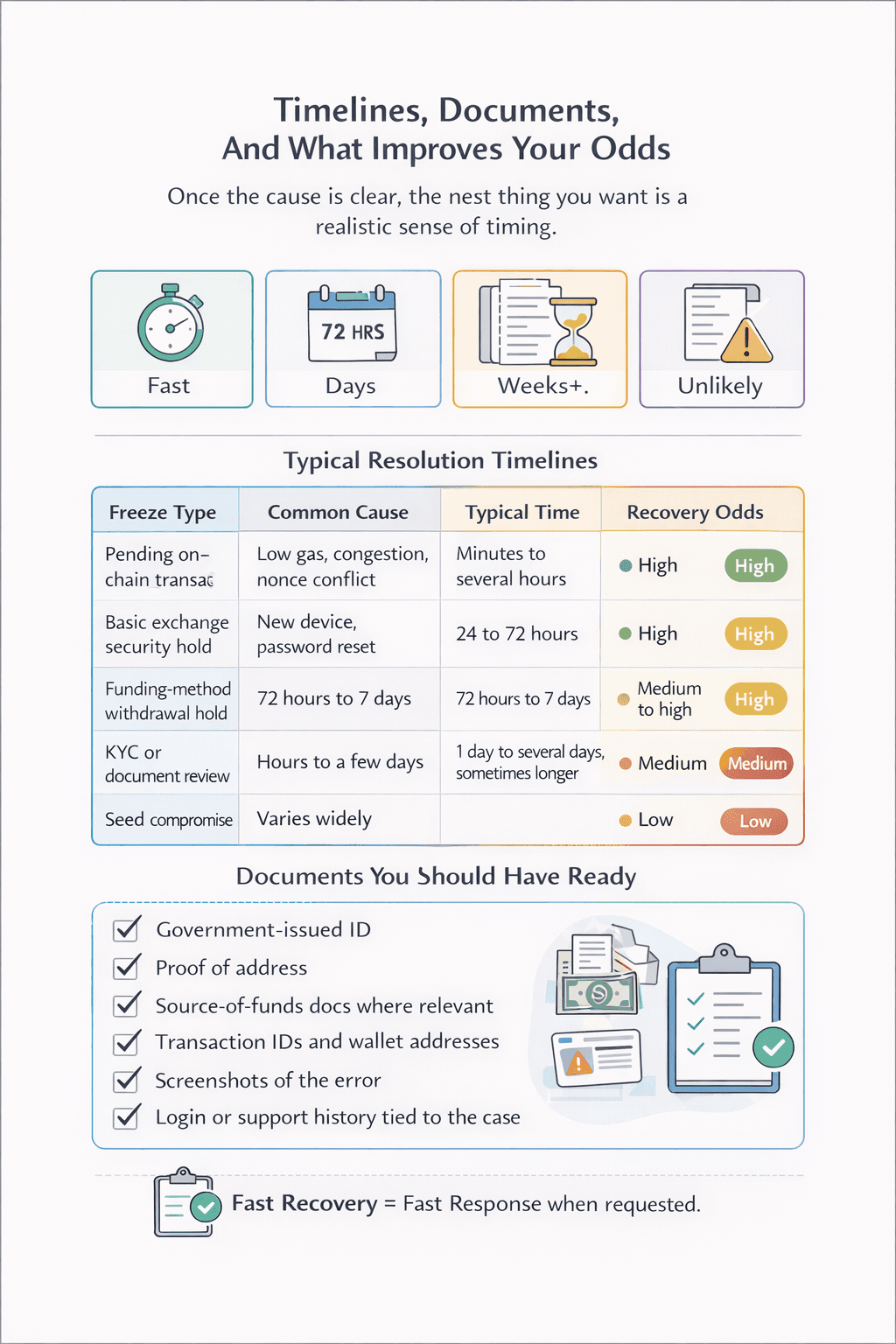 Once the cause is clear, the next thing you want as a hodler is a realistic sense of timing. That part matters because frozen crypto feels worse when the user has no frame of reference. A pending transaction may clear in minutes. A platform review may take a day or two. A compliance-heavy case can drag well beyond that, especially when the exchange is waiting for identity or source-of-funds material. Coinbase’s identity verification FAQ shows how central verification is to restoring account functionality.