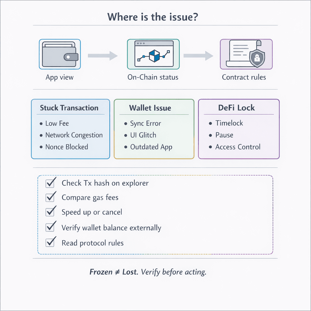 When crypto gets frozen, most users make the same mistake right away, by assuming their coins are gone. Usually, that is not what happened. In most cases, the problem sits somewhere between access, execution, and platform controls. An exchange may pause withdrawals after spotting unusual activity. A wallet may show stale or broken information even though the funds are still visible on-chain. A DeFi protocol may lock withdrawals because of contract rules, not because the assets disappeared.