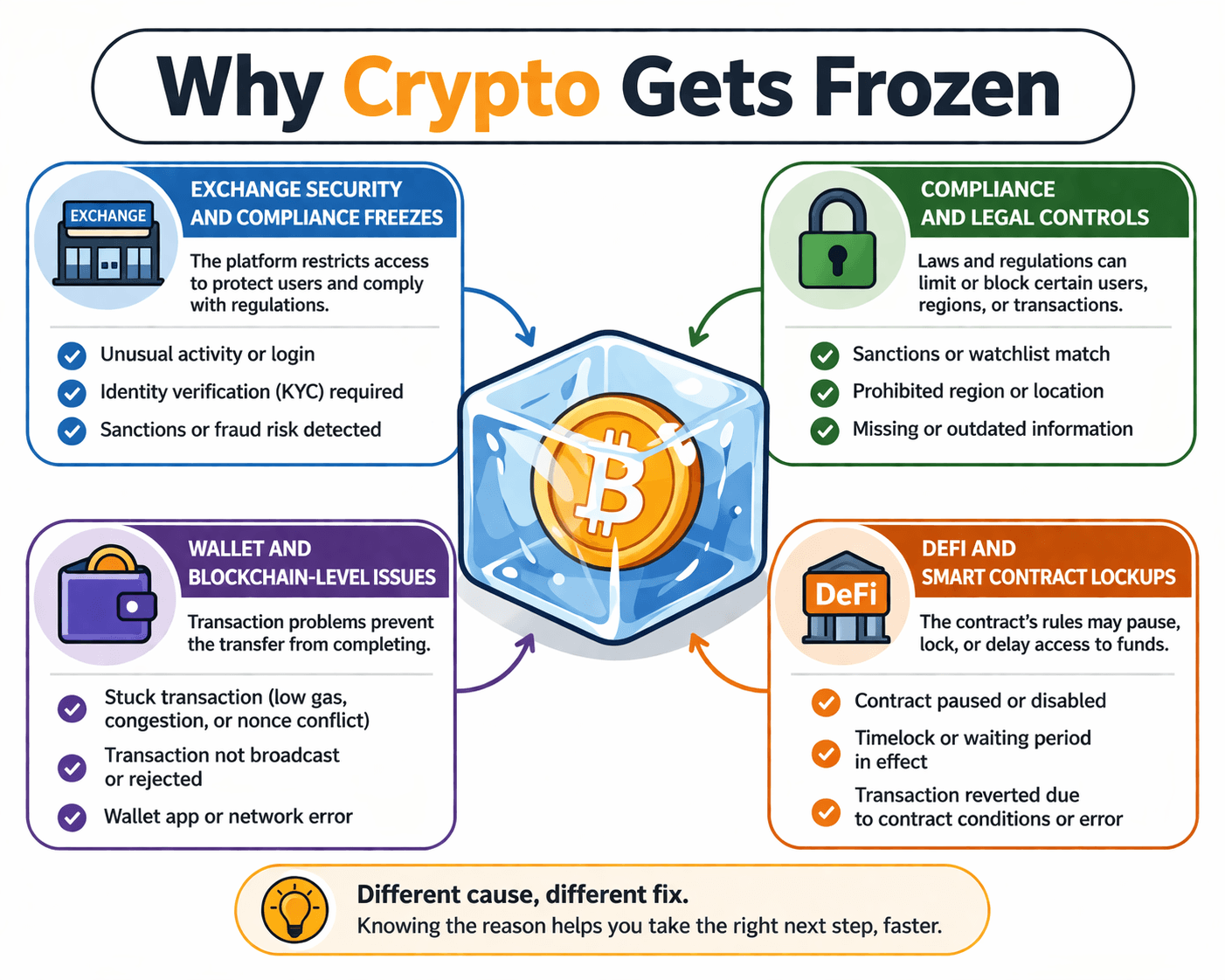 Crypto gets “frozen” for a handful of recurring reasons. Some freezes come from exchanges trying to protect themselves or comply with regulations. Some come from wallet or network issues that stop a transaction from clearing. Others come from DeFi contracts that are built to pause, lock, or delay funds under certain conditions. Grouping them by what users actually experience makes the whole thing easier to understand and far more useful in a stressful moment.