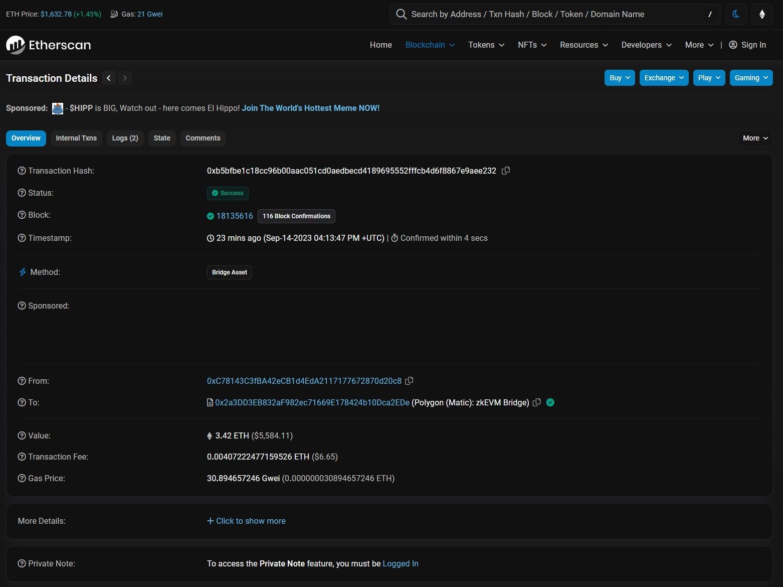 Let’s follow a cross-chain transaction from Ethereum to Polygon zkEVM. Since both these chains run EVM, their operation and blockchain explorer interface are similar and easy to comprehend.