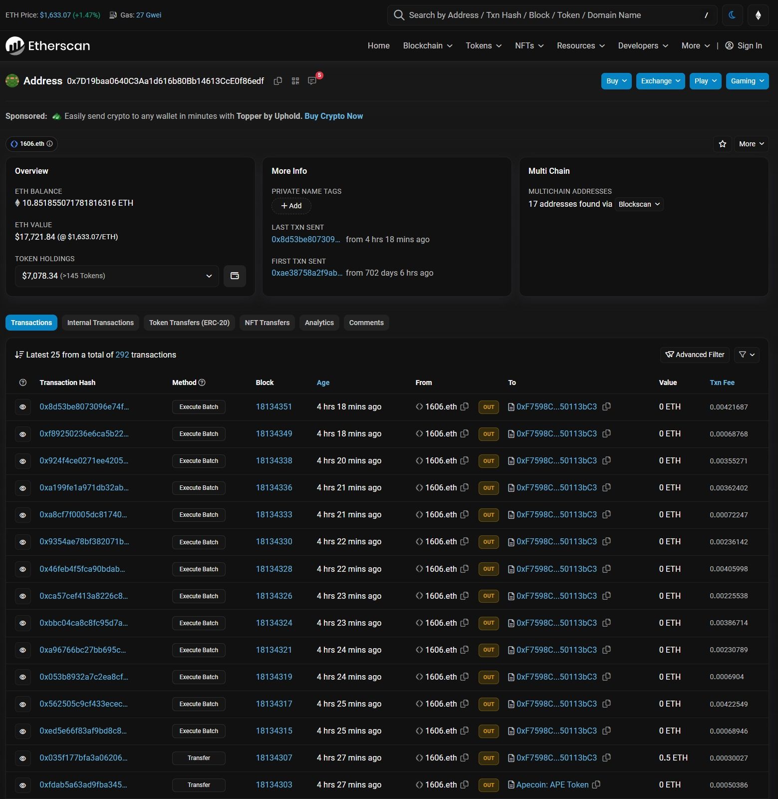 While the block page lists all the transactions within a block, users may want to track and analyze activity from a particular smart contract or wallet address. Etherscan lets users track any wallet with their public address or domain name or any smart contract with their contract address. Let’s peek into the sender address 1606.eth from the BAYC transfer above and check its activity.