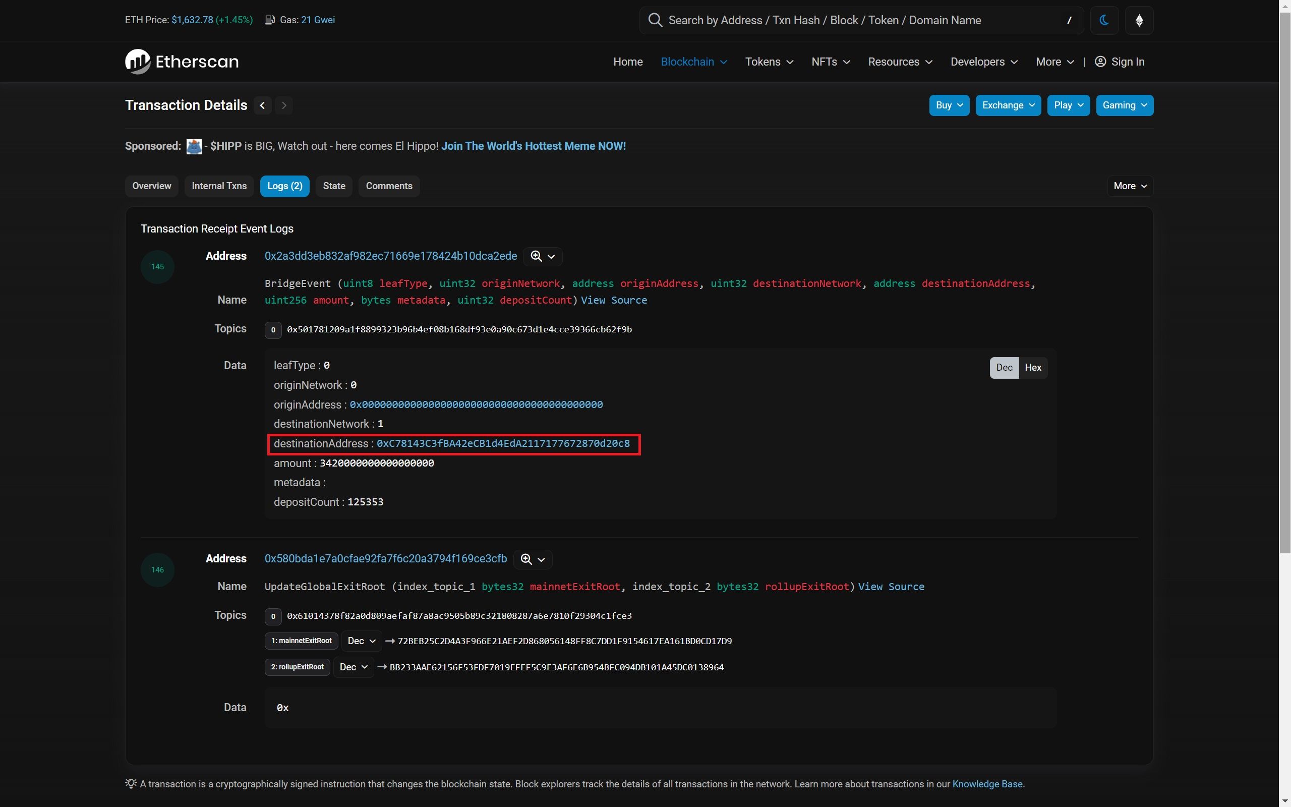 A Cross-Chain Transaction on Ethereum | Source: EtherscanThe transaction above shows the first half of a cross-chain transaction between Ethereum and Polygon zkEVM. The ‘To’ address mentioned here is the Polygon zkEVM bridge smart contract deployed on Ethereum. We can look into logs to determine how this transaction passes all the necessary information cross-chain.