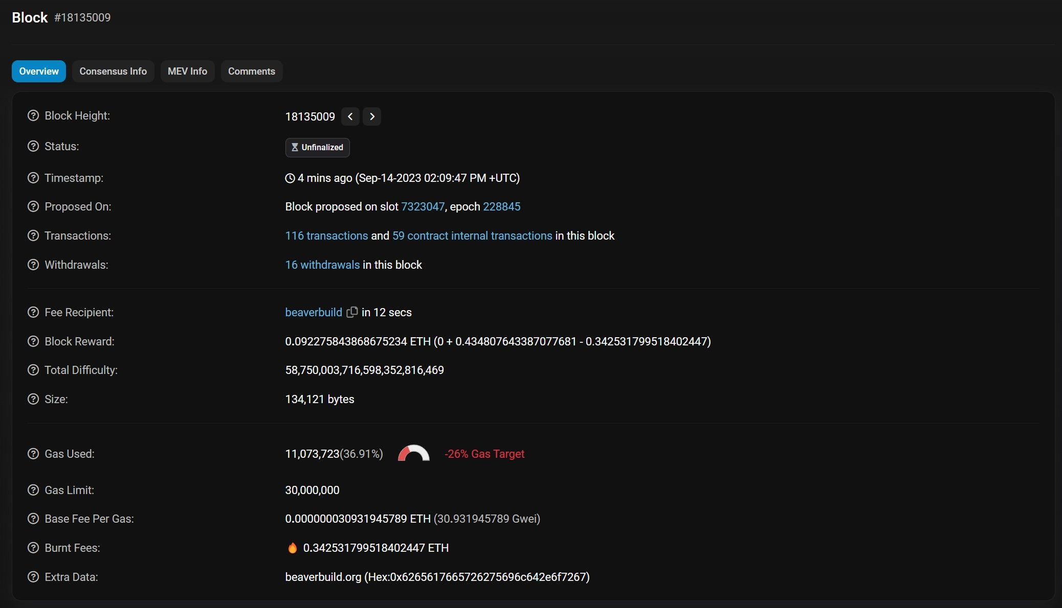 Let’s dive into one of the blocks to uncover more insights. The blocks are chronologically listed on the left side by their block number. You can click on any block number link or look it up using the number on the search bar. Here is a snapshot of block #18135009: