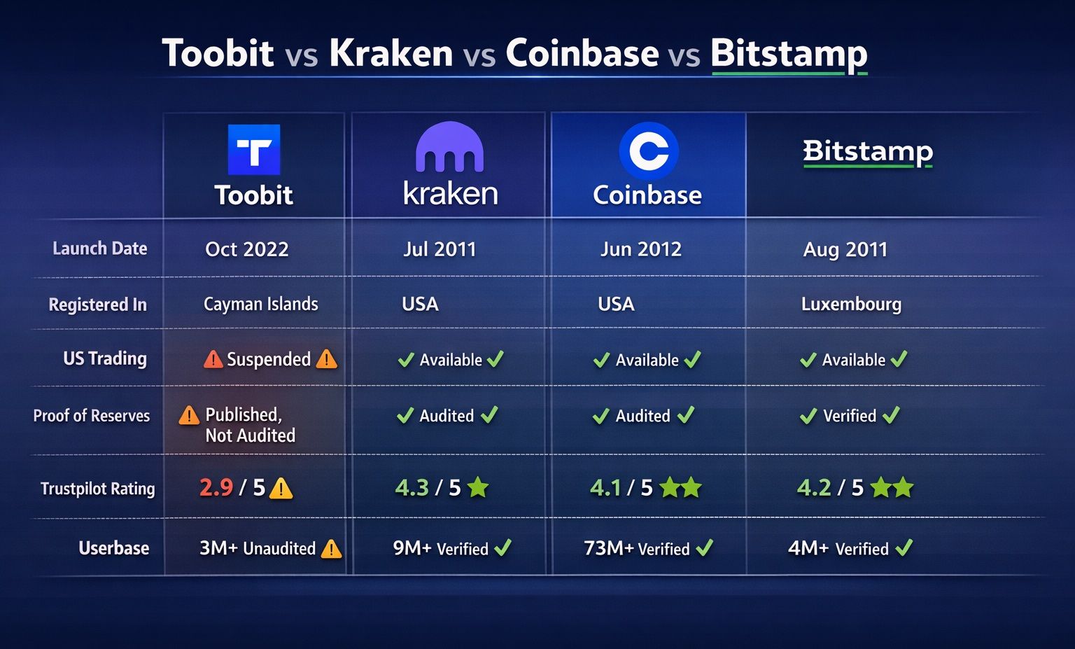 Established exchanges still face threats, but the “can I withdraw when it matters” anxiety is materially more central to Toobit’s risk profile than to Kraken, Coinbase, or Bitstamp, based on the combination of its offshore terms posture and the withdrawal-friction pattern observed in testing.