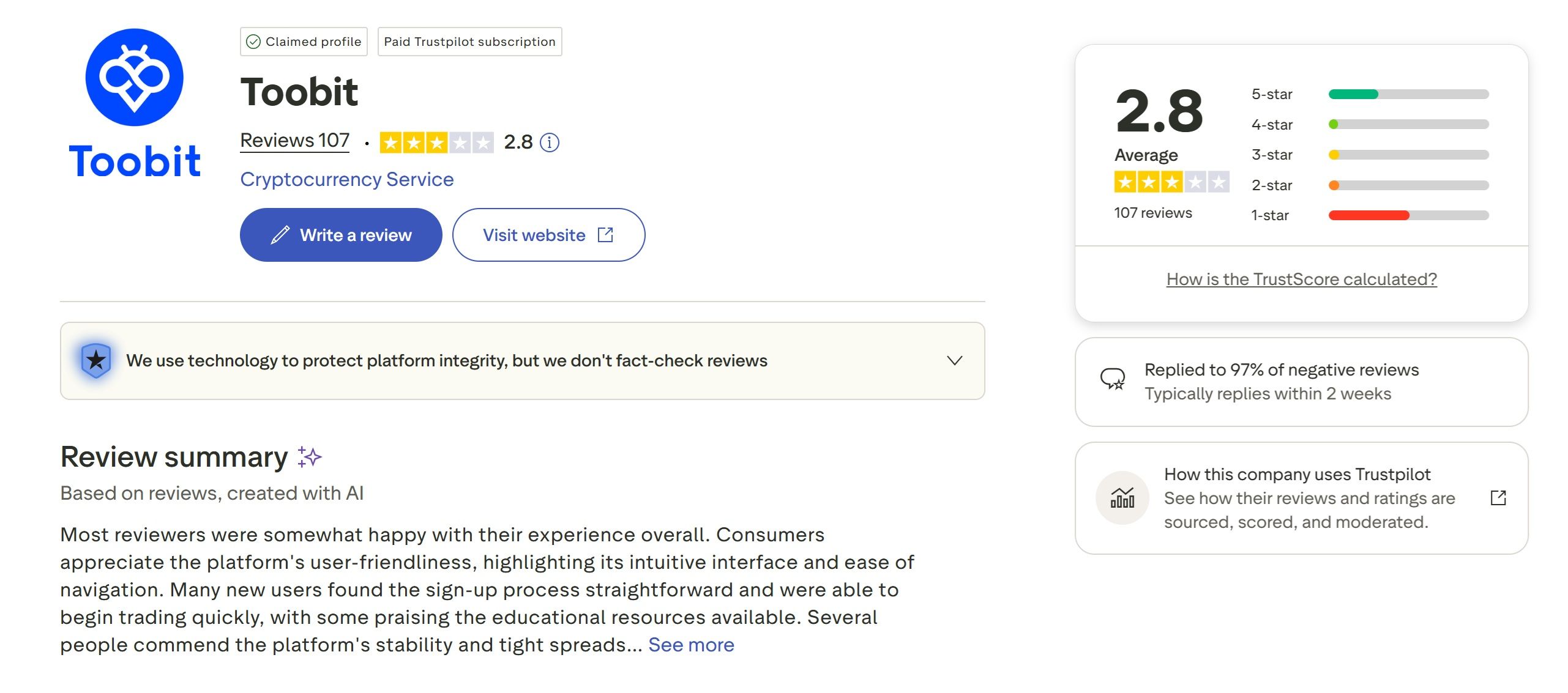 Trustpilot isn’t a technical audit, but it’s a decent “smoke alarm” for recurring user pain points. As of its February 2026, Toobit's TrustPilot profile shows a TrustScore of 2.8 (displayed as “Average”) with 107 reviews, enough volume to spot repeating themes, including complaints that cluster around withdrawals and account restrictions.