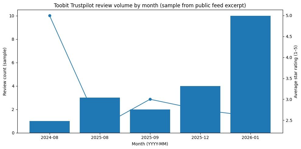 Trustpilot is currently the cleanest single snapshot source because it aggregates complaints and praise with timestamps and distribution. Toobit’s Trustpilot score is low, and the review set includes recurring friction themes.