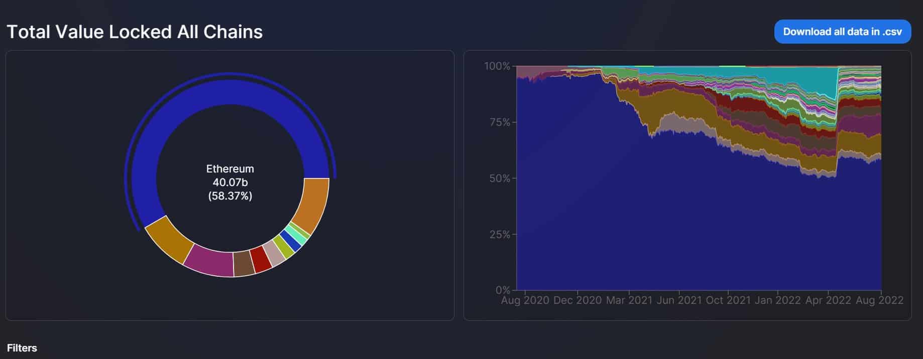 In fact, if we take a look at DeFi Llama, a popular site that tracks smart contract-enabled blockchain protocols and DApps, there are 130 Ethereum competitors listed. It is important to understand the vastness and importance of Ethereum as a layer 1 protocol as it currently has over 58% market share dominance over the entire DeFi industry: