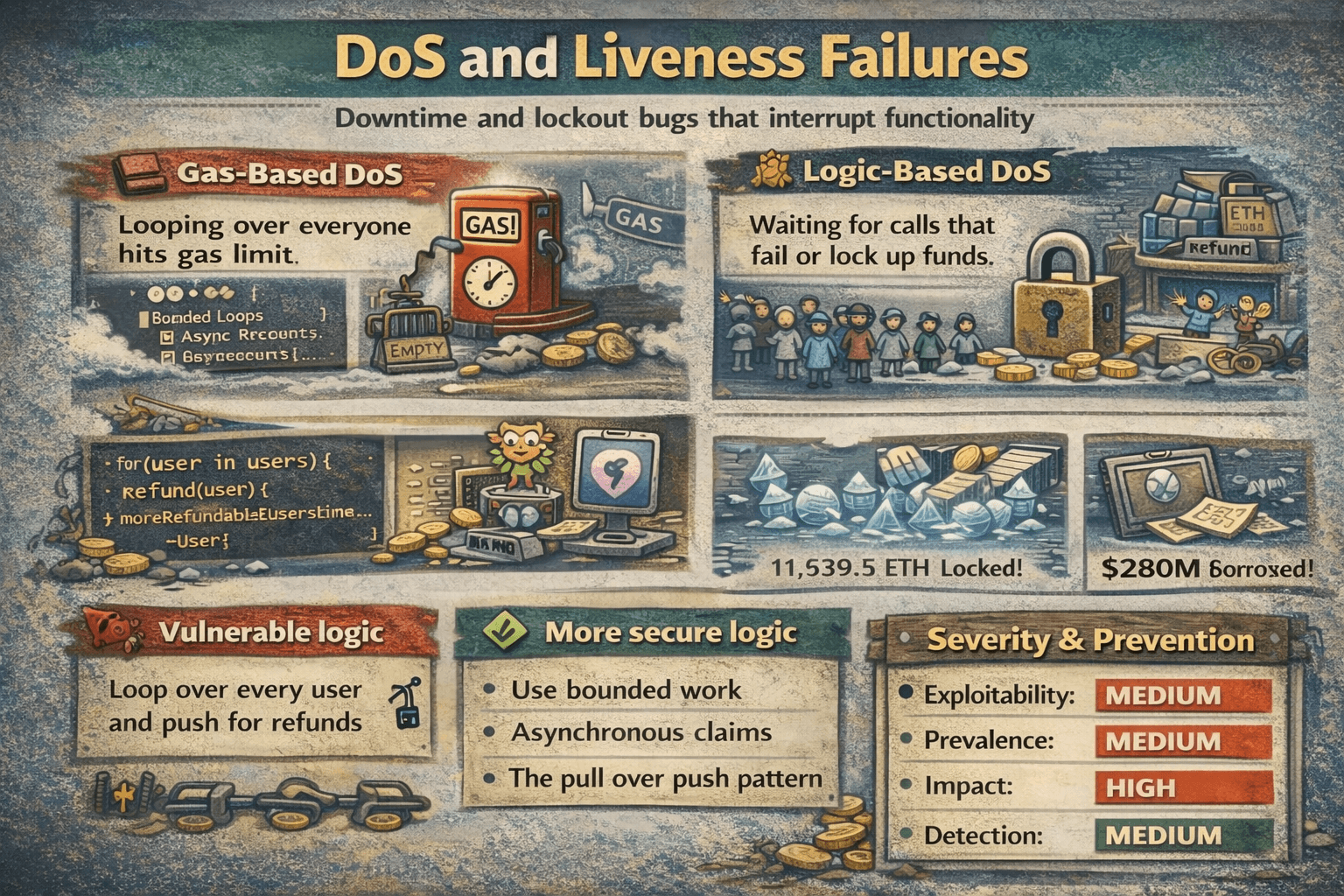 A DoS or liveness failure happens when a contract becomes unusable, even if no one directly steals funds. This often comes from designs that can be forced to run out of gas or get stuck waiting for an action that can never succeed.