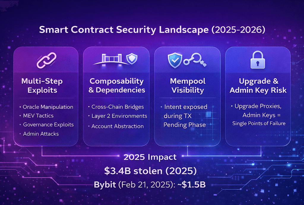 In 2025 and 2026, smart contracts remain a major security risk. What’s changed is the shape of many incidents. Instead of one obvious bug, attackers often chain together smaller weaknesses across connected systems to create a much larger failure.