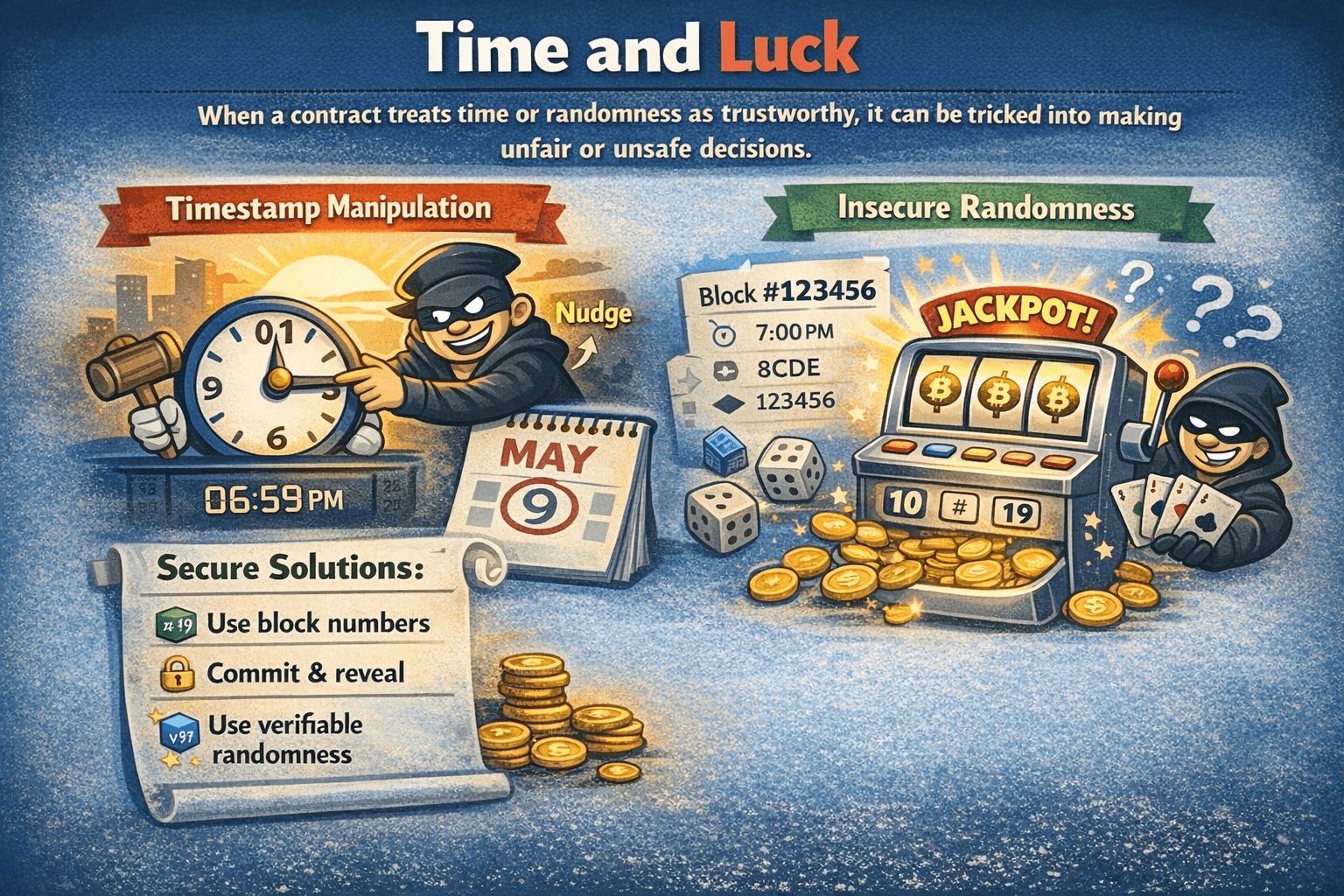 When a contract treats time or randomness as trustworthy, it can be tricked into making unfair or unsafe decisions. On public blockchains, those inputs are often predictable enough that attackers can game them.