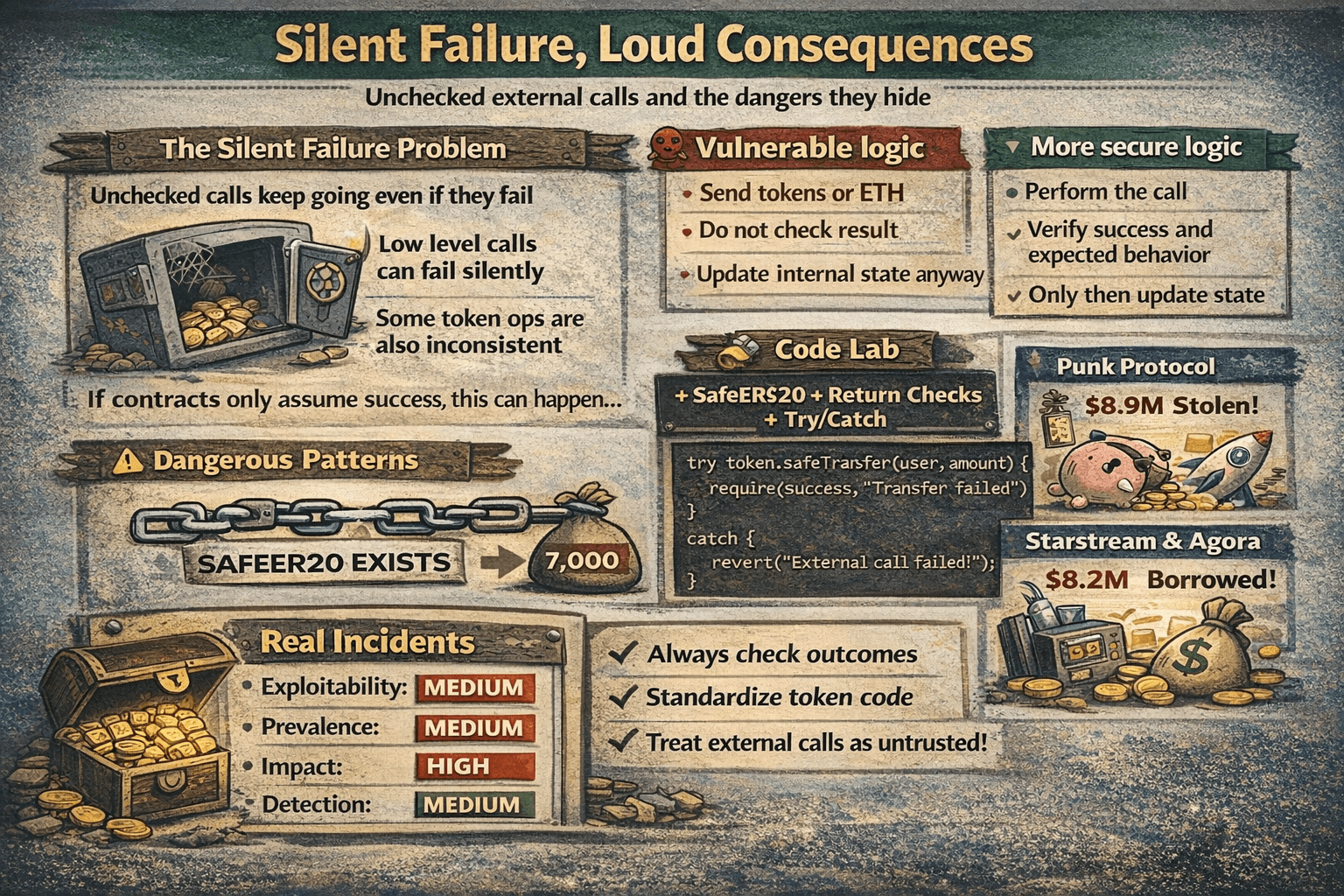 Prevention is simple: always check outcomes, standardize token interactions, and treat external calls as untrusted. What users can do is prefer protocols that use established libraries like SafeERC20 and avoid systems that rely on fragile integrations where a single failed call could break accounting.