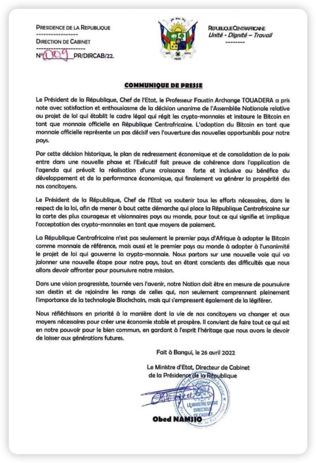 The Official Document Recognizing BTC as Legal Tender CAR lawmakers unanimously approved the bill to legalize the use of crypto in the country and made Bitcoin along with the CFA Franc legal tender. This marked the second country in the world to make this leap. The framework allows citizens to pay their taxes in crypto and use it as a form of payment for businesses.