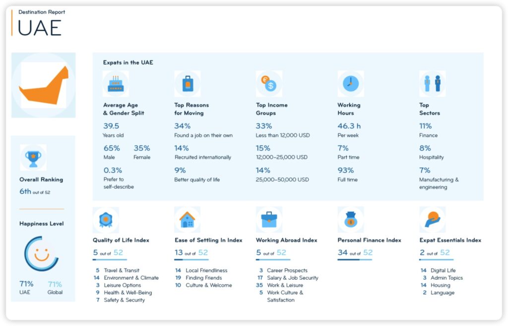 The UAE at a Glance. Image via internations.org You would think that a land full of millionaires and luxury everything would come with an insanely high cost of living, but Dubai is actually quite affordable with an estimated monthly living cost for a single person coming in at around $US 2,700 per month.