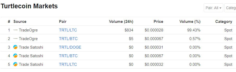 TRTL Markets on CoinMarketCapGiven that Turtlecoin is still a relatively small new project that is in development stage, there has not been that much activity in the markets. It seems that the only place that you can really trade TRTL currently is on the TradOgre market.