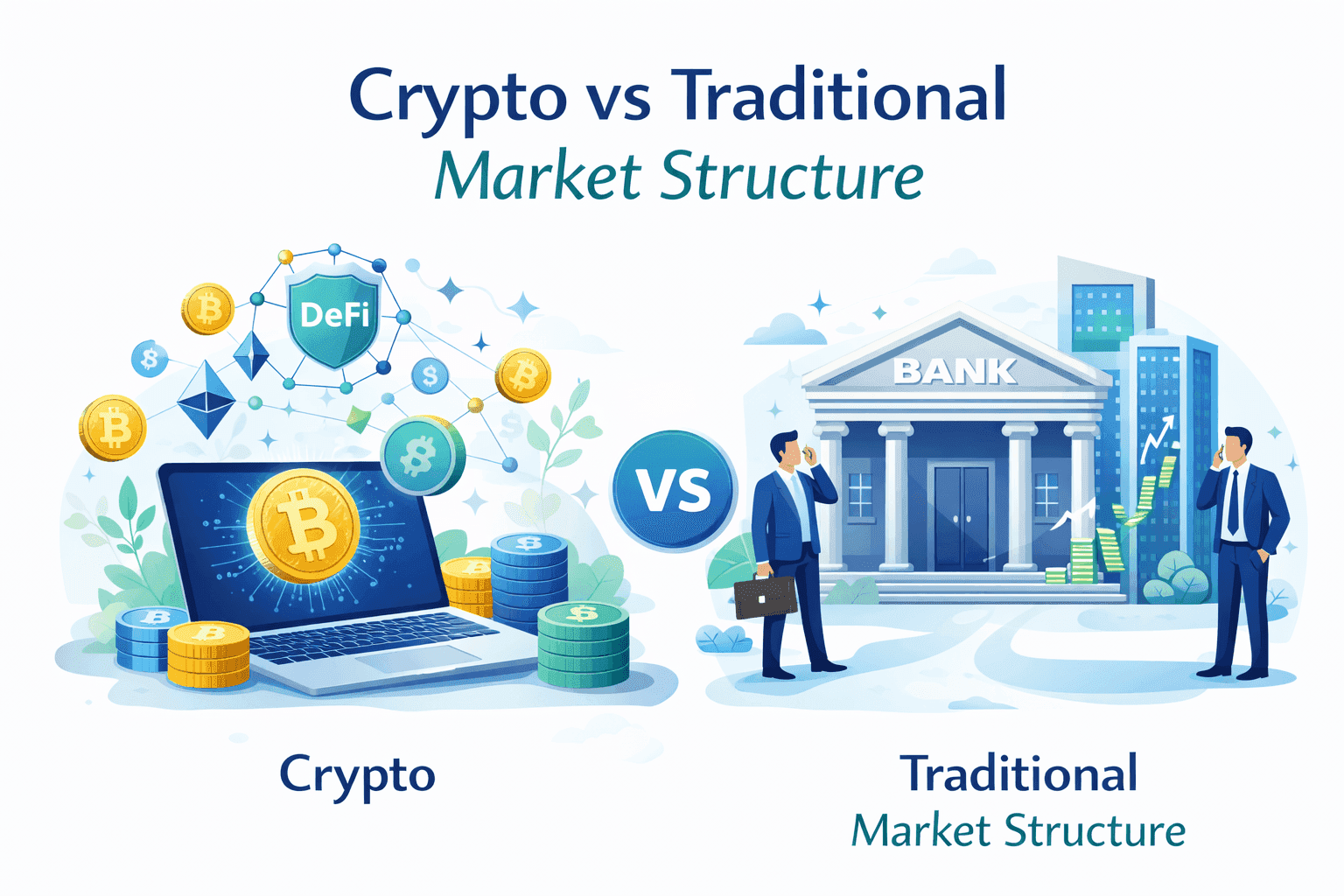 Crypto markets often get compared to equities or foreign exchange, but the similarities are mostly superficial. Underneath, the structural rules are different. These differences explain why crypto behaves more violently during stress, why retail and institutions interact directly, and why correlations shift depending on macro conditions.