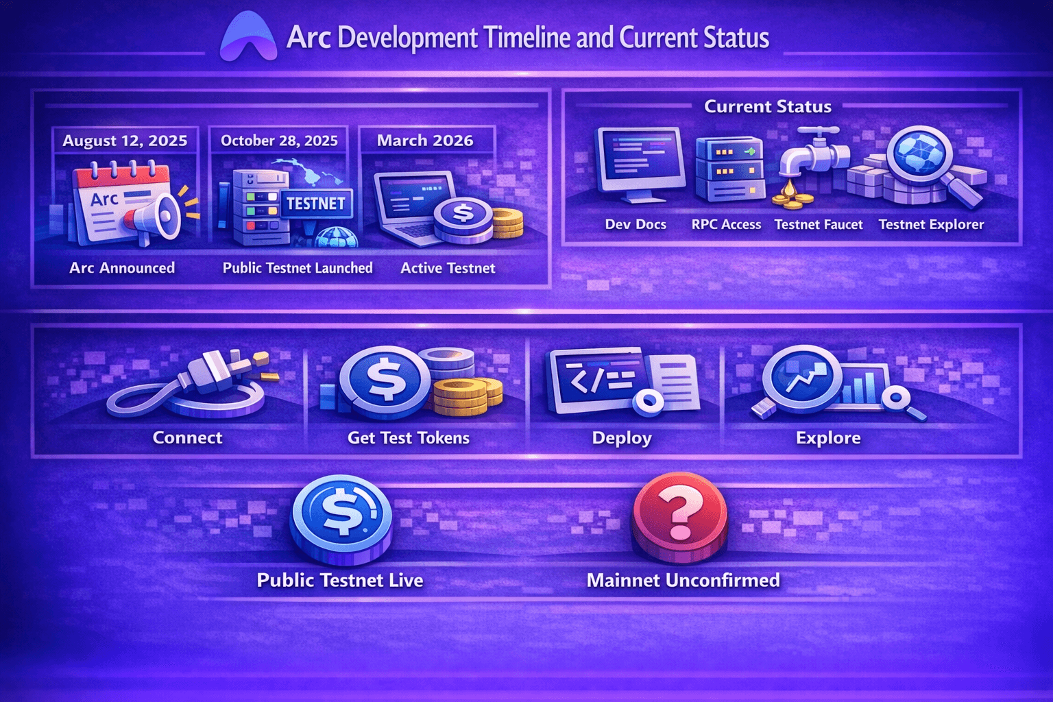 - April 2026: Arc remains in an active testnet phase, with testnet tooling available through the docs and faucet.