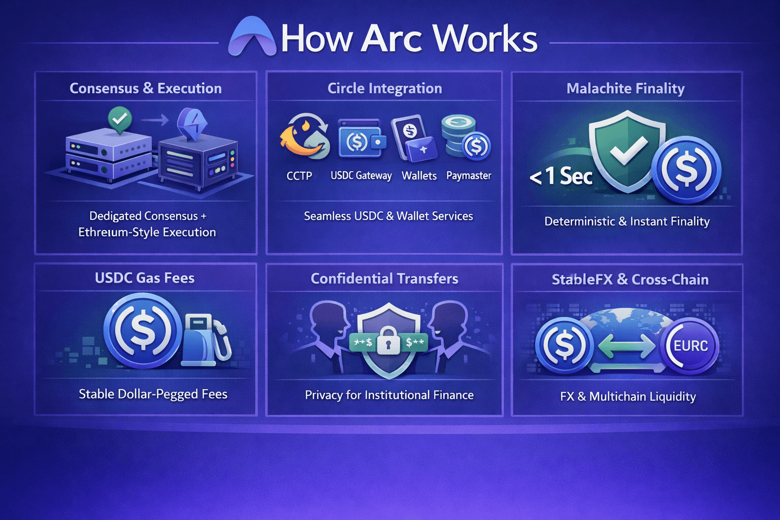 Arc is an open Layer 1 blockchain built by Circle for stablecoin-native finance. BlackRock, Visa, Goldman Sachs and AWS are among over 100 major institutions testing the network.