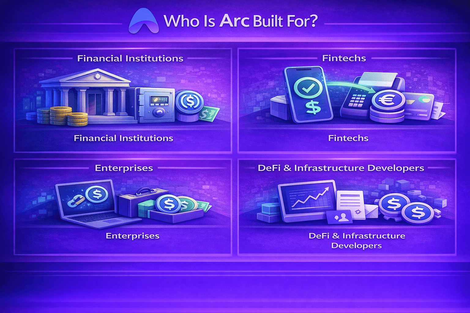 Arc is built for a fairly specific audience. It is aimed at organizations and developers that want blockchain infrastructure for payments, settlement, FX, and tokenized finance, rather than a chain optimized mainly for retail trading or broad consumer crypto activity. In practice, that puts four groups at the center: financial institutions, fintechs, enterprises, and DeFi or infrastructure developers.