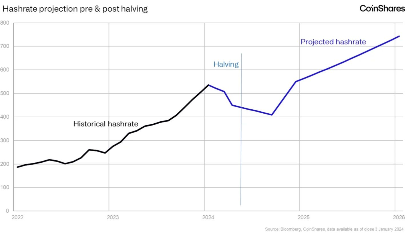 Bitcoin's Hashrate is Expected to Surge Following the Halving. Image via CoinShares All this is music to big miners' ears.