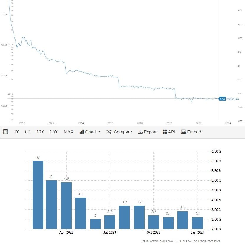 Bitcoin's Inflation (Top) is Far Lower Than That of the American Economy. Images via Woobull and Trading EconomicsEnter Bitcoin