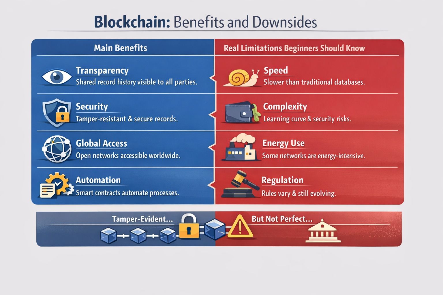 Blockchain is one of those technologies that can be really useful but only in the right situations. It does have some obvious strengths, like making records more transparent and harder to mess with. At the same time, it comes with trade-offs that people rarely notice until they actually try using it: things can be slower, harder to use safely, sometimes more energy-heavy (depending on the network), and the surrounding rules are still being written in many places.