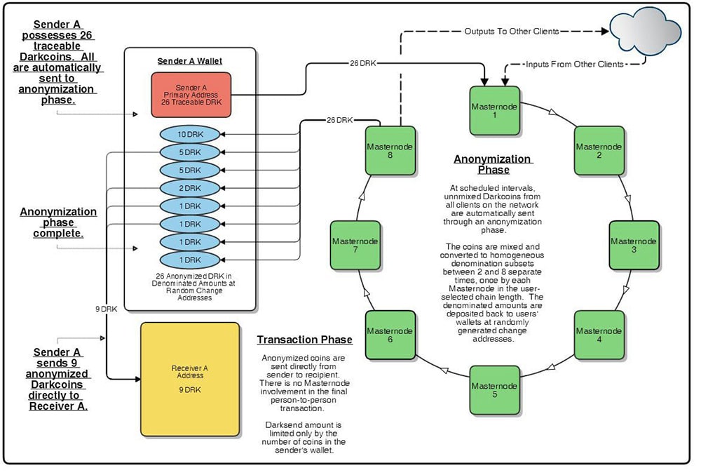 However, when someone does an analysis of the transactions on the Dash blockchain all that they will see is a mixture of smaller coins flowing into your wallet. They cannot see how much coins you own and have been spent. Exactly how the Darksend transactions work is presented in the below image. These were developed when Dash was originally called "Darkcoin". Its name was changed for obvious reasons.