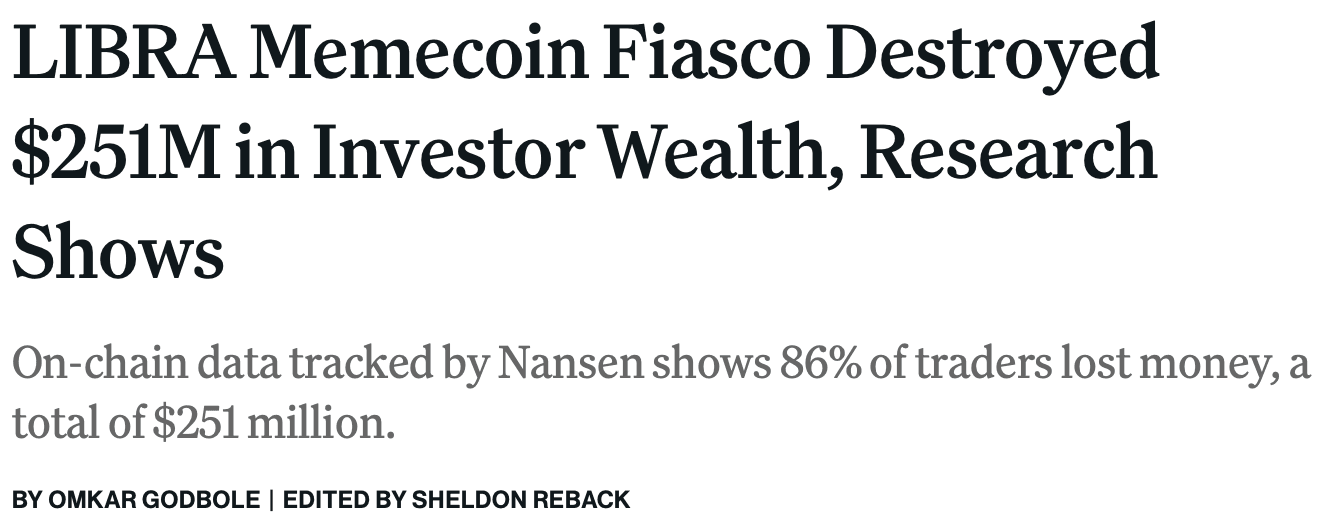 86% of Traders Lost Money on LIBRA. Image via CoinDeskBut behind the scenes, insiders offloaded massive amounts of tokens, and the market cap plunged by 90% in less than 12 hours. On-chain data revealed that 86% of traders lost money, with total losses exceeding $250 million. The aftermath? A federal investigation, asset freezes, and a massive political scandal.