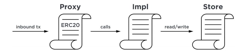 Contract Separation on Gemini Dollar. Source: WhitepaperThe “Impl” layer is where the data and logic for the smart contracts resides. That includes the logic for token creation, destruction and transfer. The logic on this layer is similar to that seen in most ERC-20 tokens. The main difference is that the smart contract features in this layer will only work when allowed to do so by the Proxy layer.