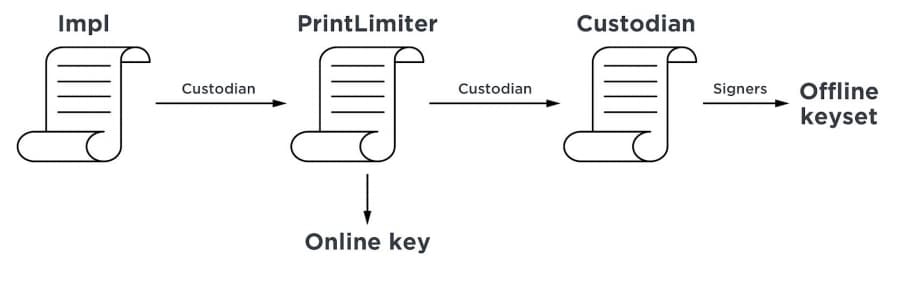 This forces any chain of custodians to end at the centralized offline keyset to approve new smart contracts.
