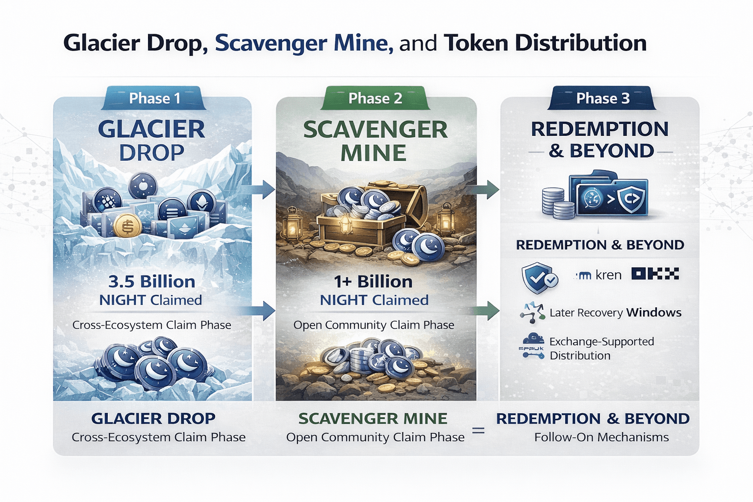 So, the simple version is that Glacier Drop seeded the first wave, Scavenger Mine widened the second, and the collection path after that runs through Redemption, Lost-and-Found, and exchange-supported distribution where applicable. That is the structure worth remembering, because the headline numbers alone do not explain how the remaining NIGHT continues to reach users over time.