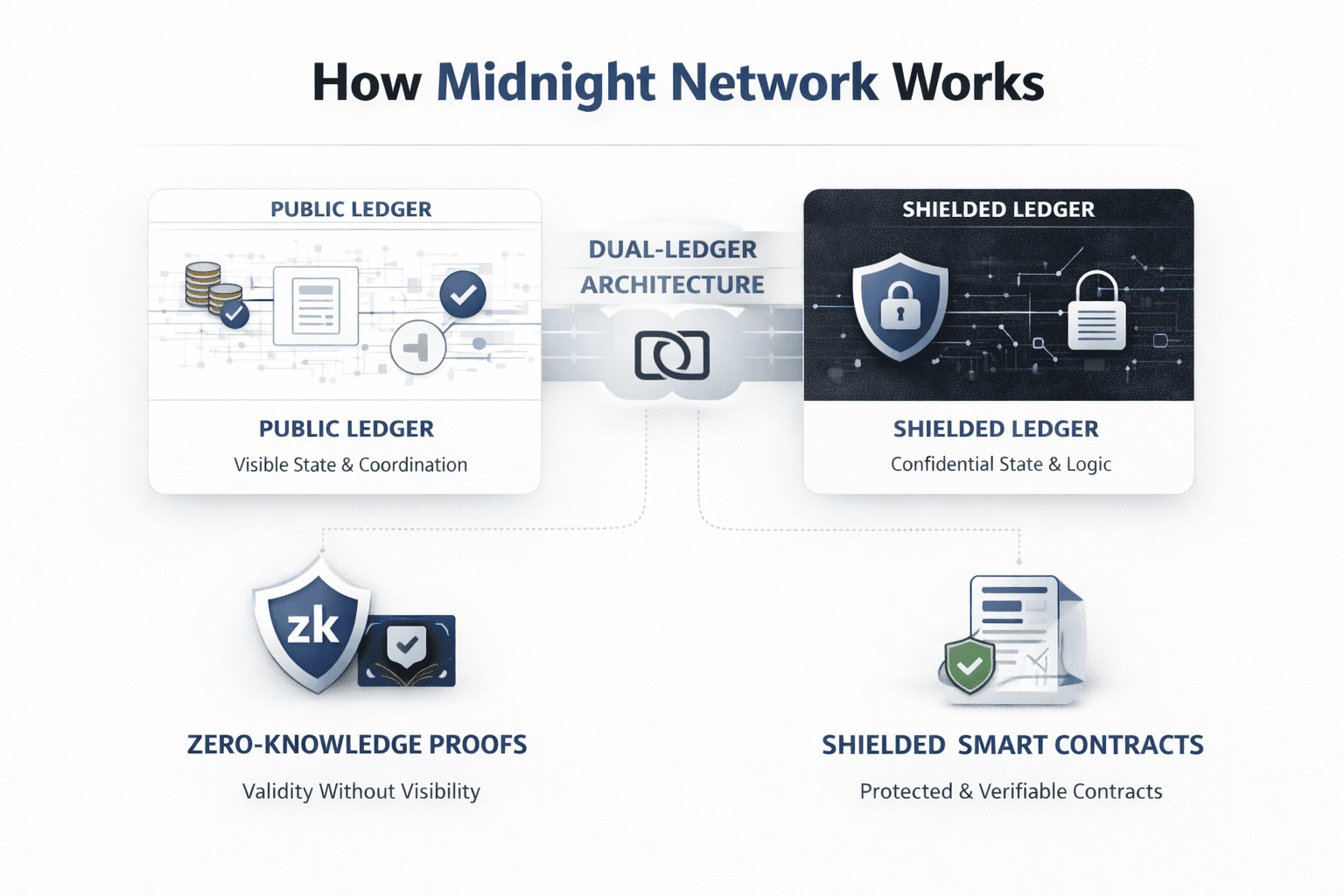 Midnight works through a design that separates public coordination from confidential execution. Its architecture combines a dual-ledger architecture with zero-knowledge proofs so applications can keep sensitive state private while still proving that transactions and contract logic followed the rules. Midnight’s own overview frames this as programmable privacy supported by a system that preserves utility, predictable operation, and developer usability.