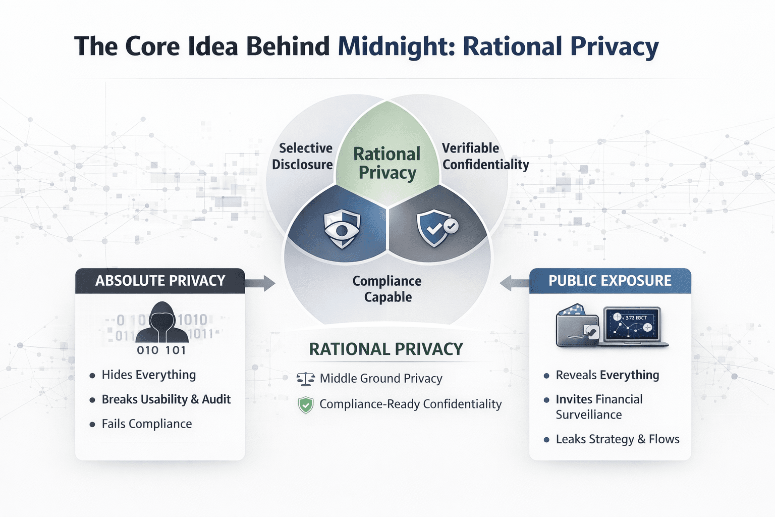 Midnight’s main idea is rational privacy: keep sensitive data private by default, make disclosure selective, and preserve enough verifiability for real applications to operate in regulated environments. It sits between total exposure and total opacity, and that middle ground is where Midnight tries to make privacy usable rather than absolute.