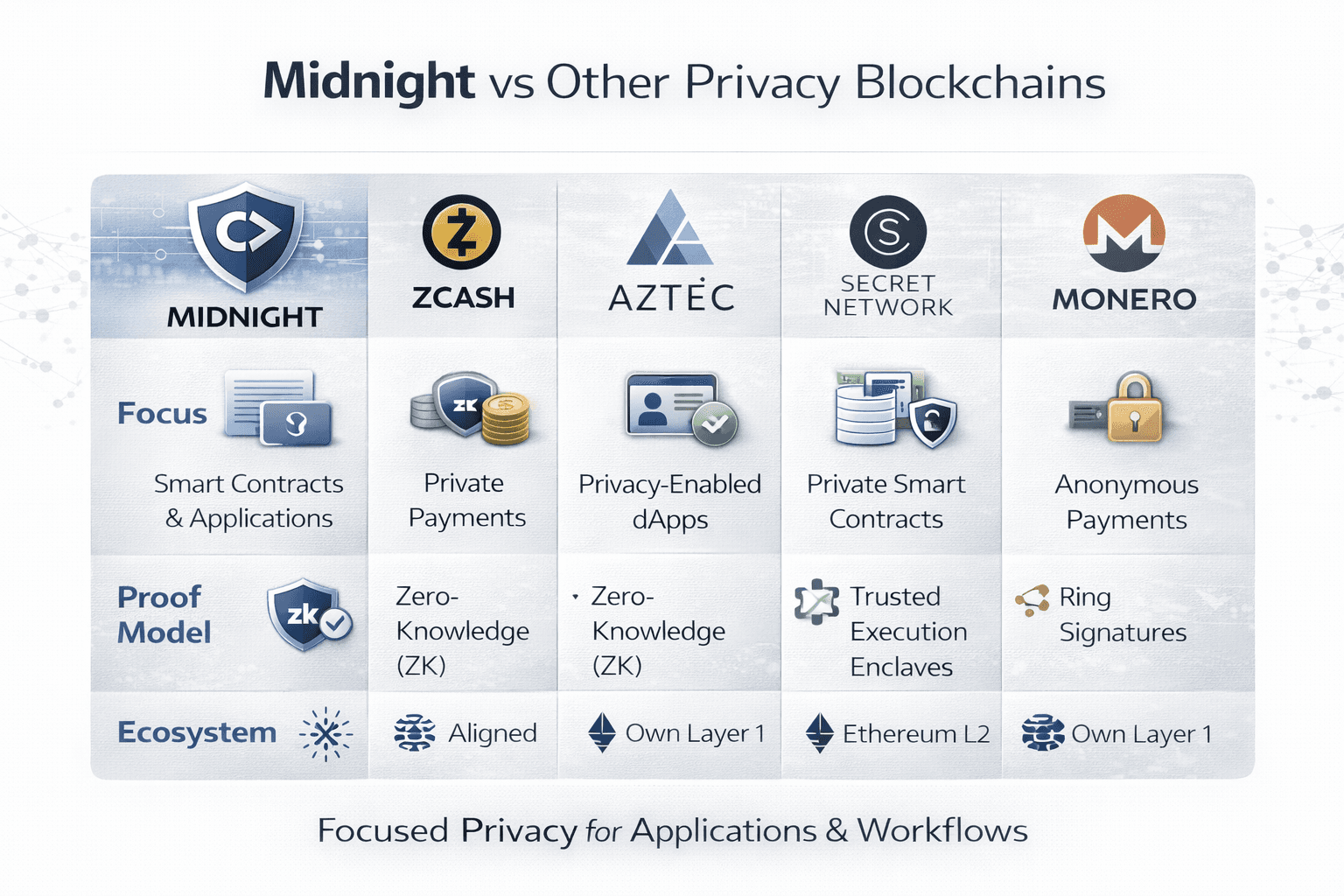 Midnight belongs in the privacy-blockchain conversation, but its position is narrower and more deliberate than many older projects in the category. The strongest comparison is not “which chain hides the most,” but what kind of privacy each system is built to deliver, where that privacy lives in the stack, and whether the design is aimed at transfers, applications, or compliance-heavy workflows.