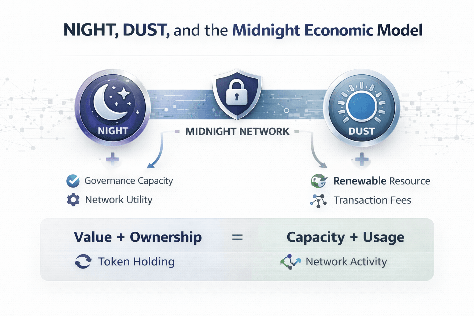 Midnight’s economic model separates value from usage. Instead of using one token for everything, it splits the system into NIGHT, which carries governance and utility functions, and DUST, which acts as the renewable resource used for network activity.