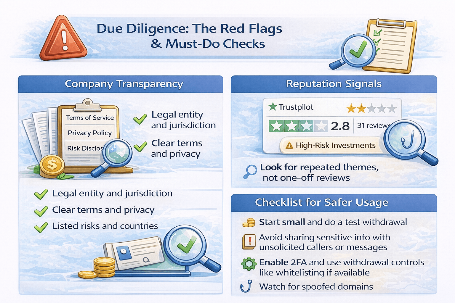 Done well, due diligence does not require deep technical knowledge, it just means confirming the fundamentals and treating unclear disclosures or repeated user reported friction as a risk signal.