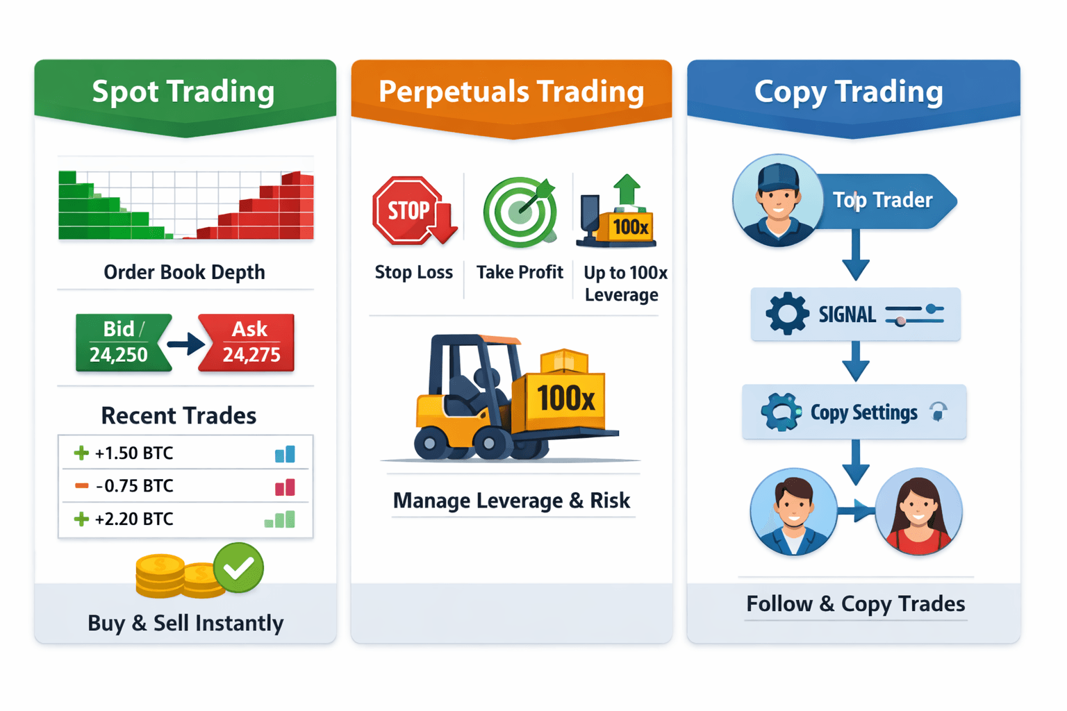 - Copy trading with leaderboards and follower controls