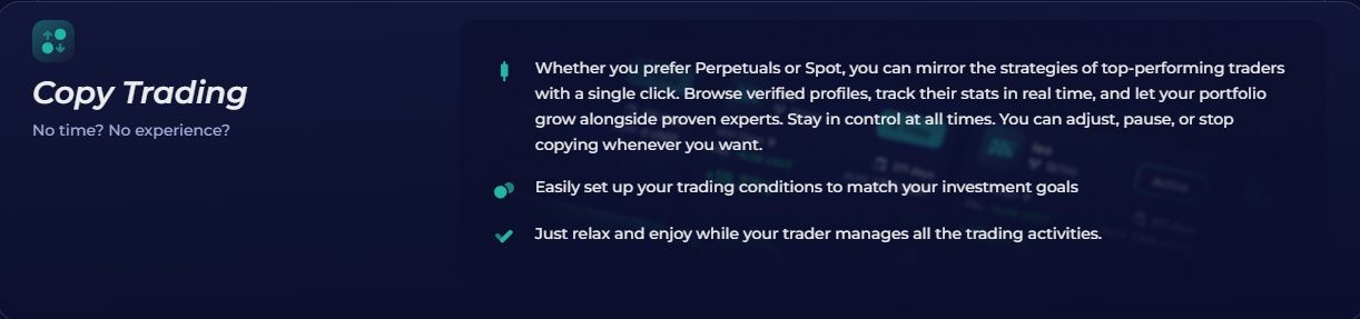 | Platform Type | Centralized exchange (spot, perpetuals, copy trading) |