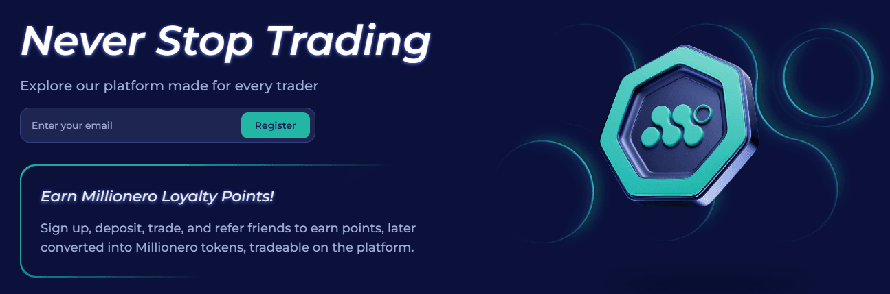 Millionero brings together three tools that tend to sit at different skill levels on most exchanges: spot trading for straightforward buying and selling, perpetuals for leveraged directional trading, and copy trading for users who prefer a more structured approach.
