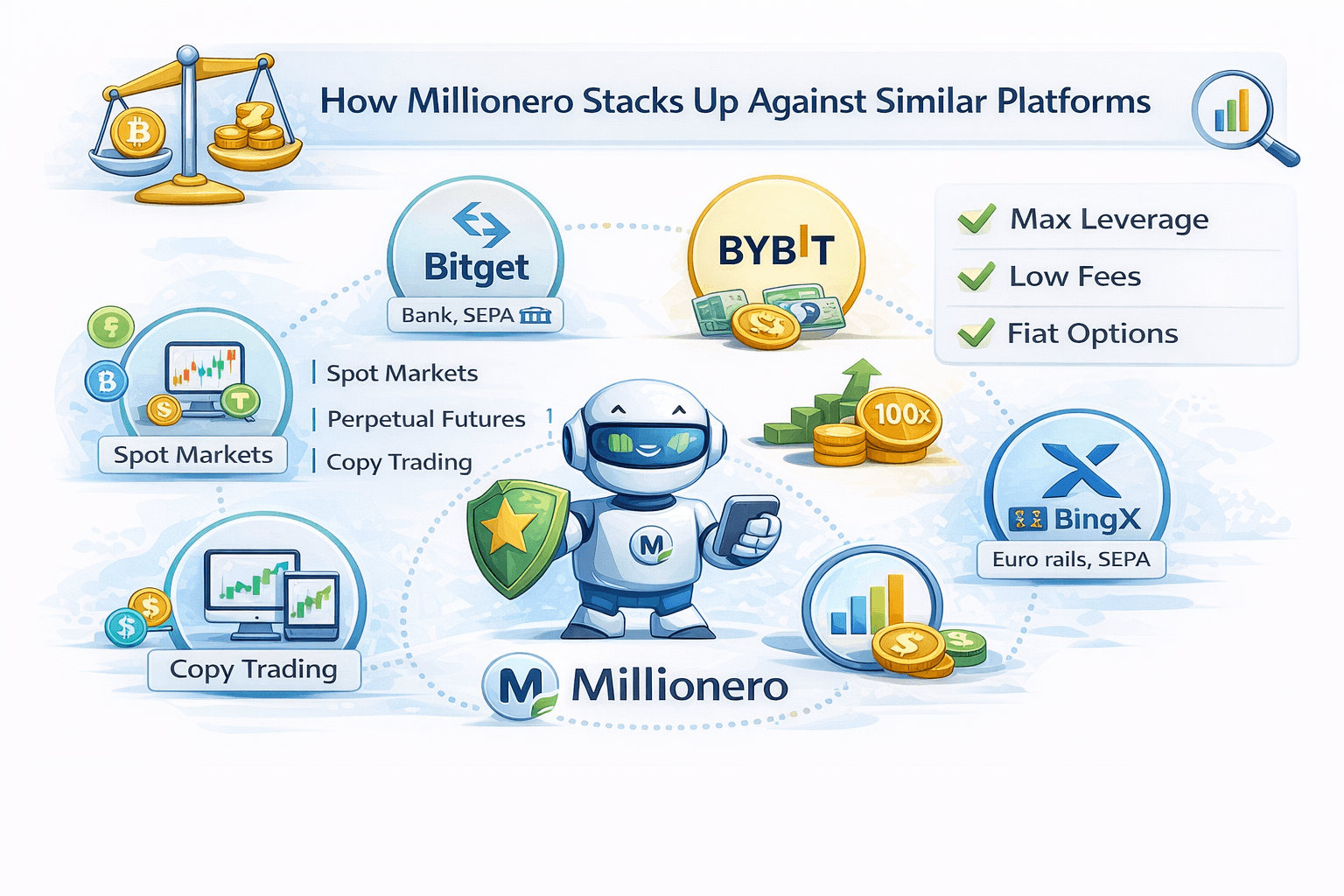 Comparisons work best when the products are broadly similar. Millionero positions itself around spot trading and perpetuals with copy trading as a key add on, so the closest benchmarks are exchanges that combine those same features at scale.
