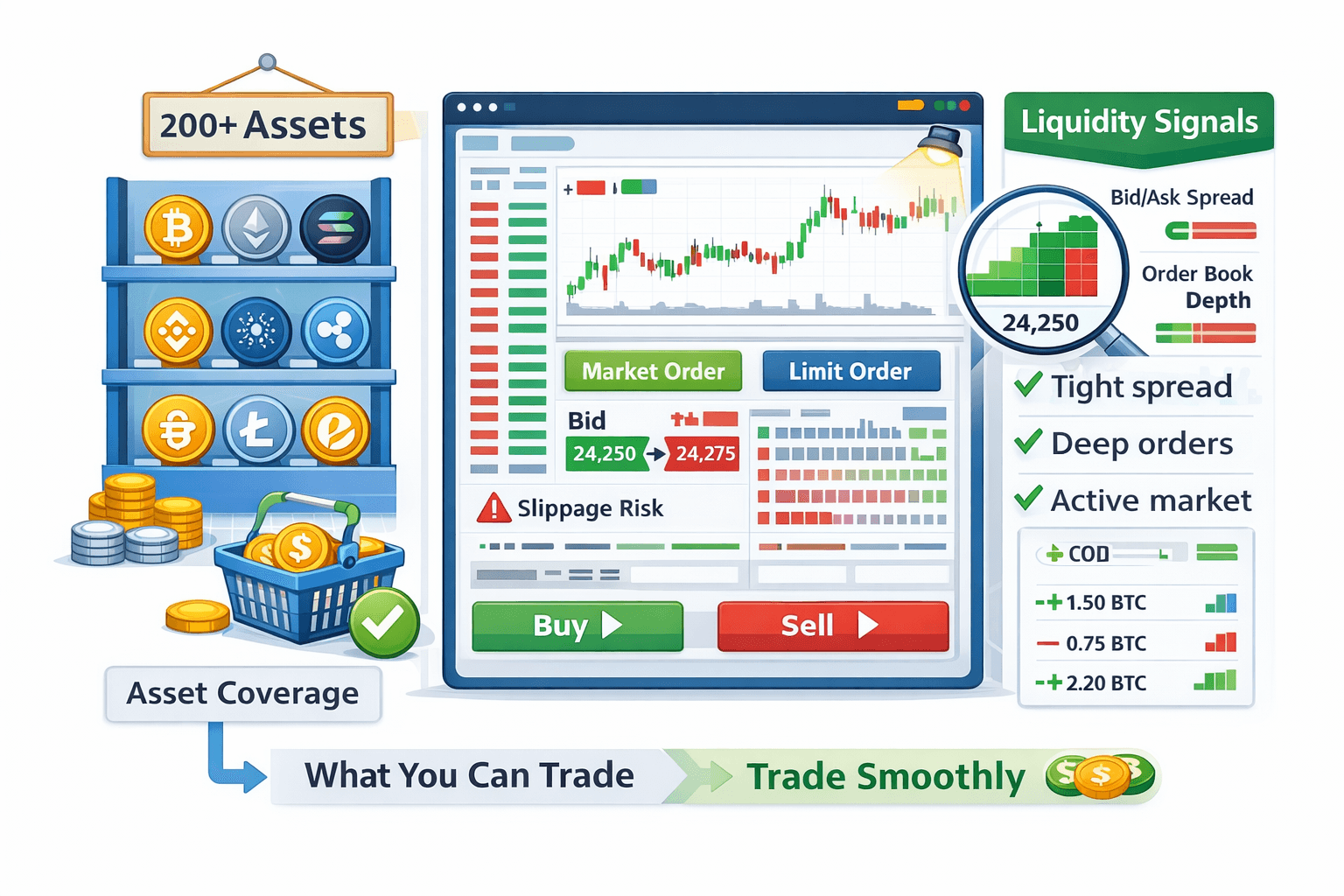 - Order book depth shows how much liquidity sits close to the current price.