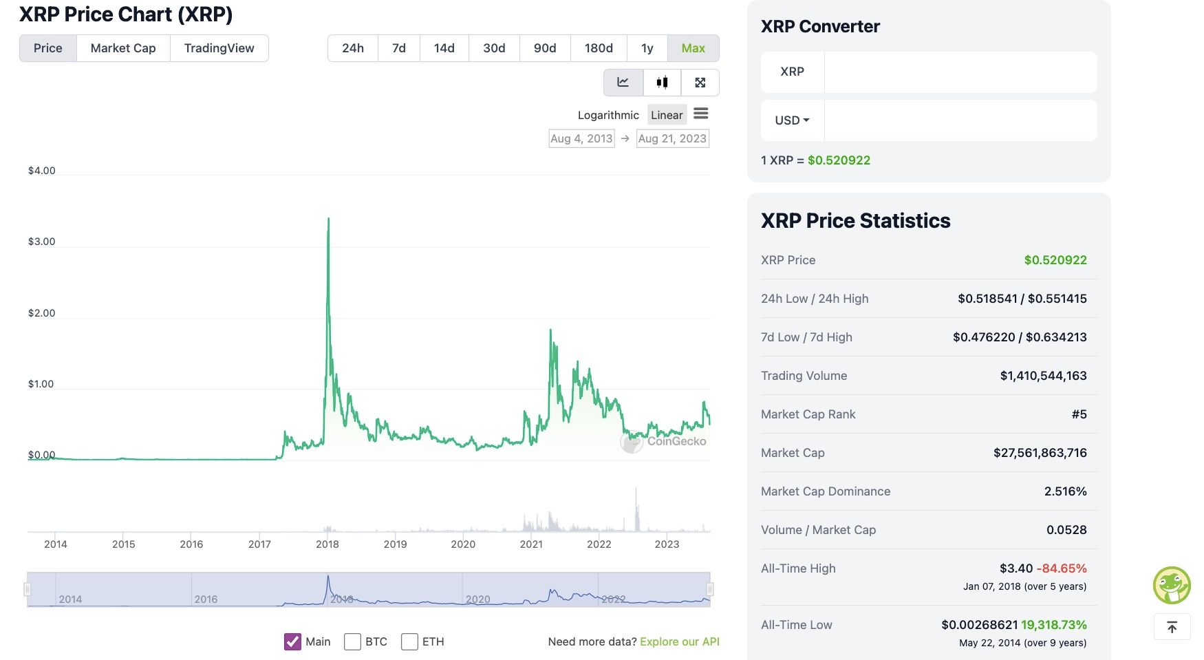 XRP is a regular guest in the top 10 crypto list by market cap. It's one of the more well-known mainstream cryptocurrencies after Bitcoin and Ethereum, mainly because of its 3-year-long lawsuit that is finally drawing to a close this year. The initial listed price of $0.00268621 back in 2014 has seen its fair share of ups and downs but the overall trajectory is a rocketship-style rush to the top, cumulating in an ATH of $3.40 in Jan 2018 for a brief moment.