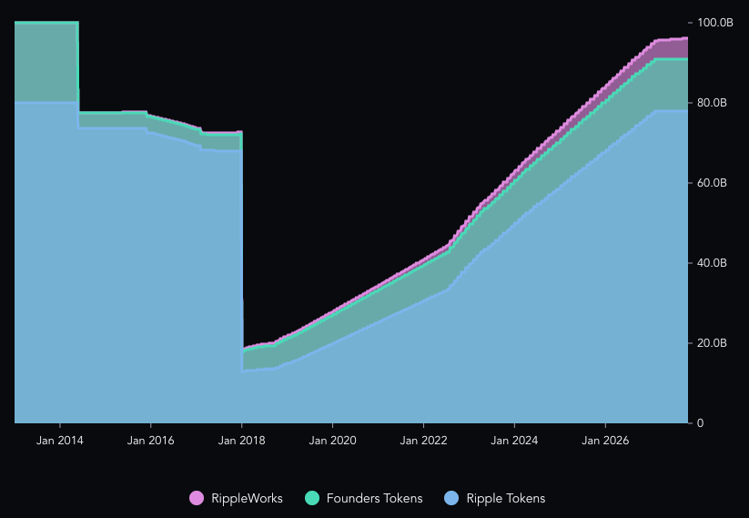 - 20 billion to founders, of which Jed McCaleb owns 9 billion. However, he is legally not allowed to dump the market after a lawsuit detailing his exit from the project in 2013.