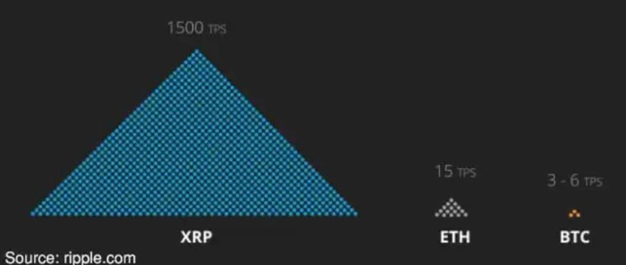 XRP transactions will settle in less than 4 seconds. Hence, when it is sent on the network, the ownership of the asset changes hands almost instantaneously. This is unlike Bitcoin transactions which tend to take up to an hour, depending on network conditions. You can see a comparison in the image below of transactions per second.