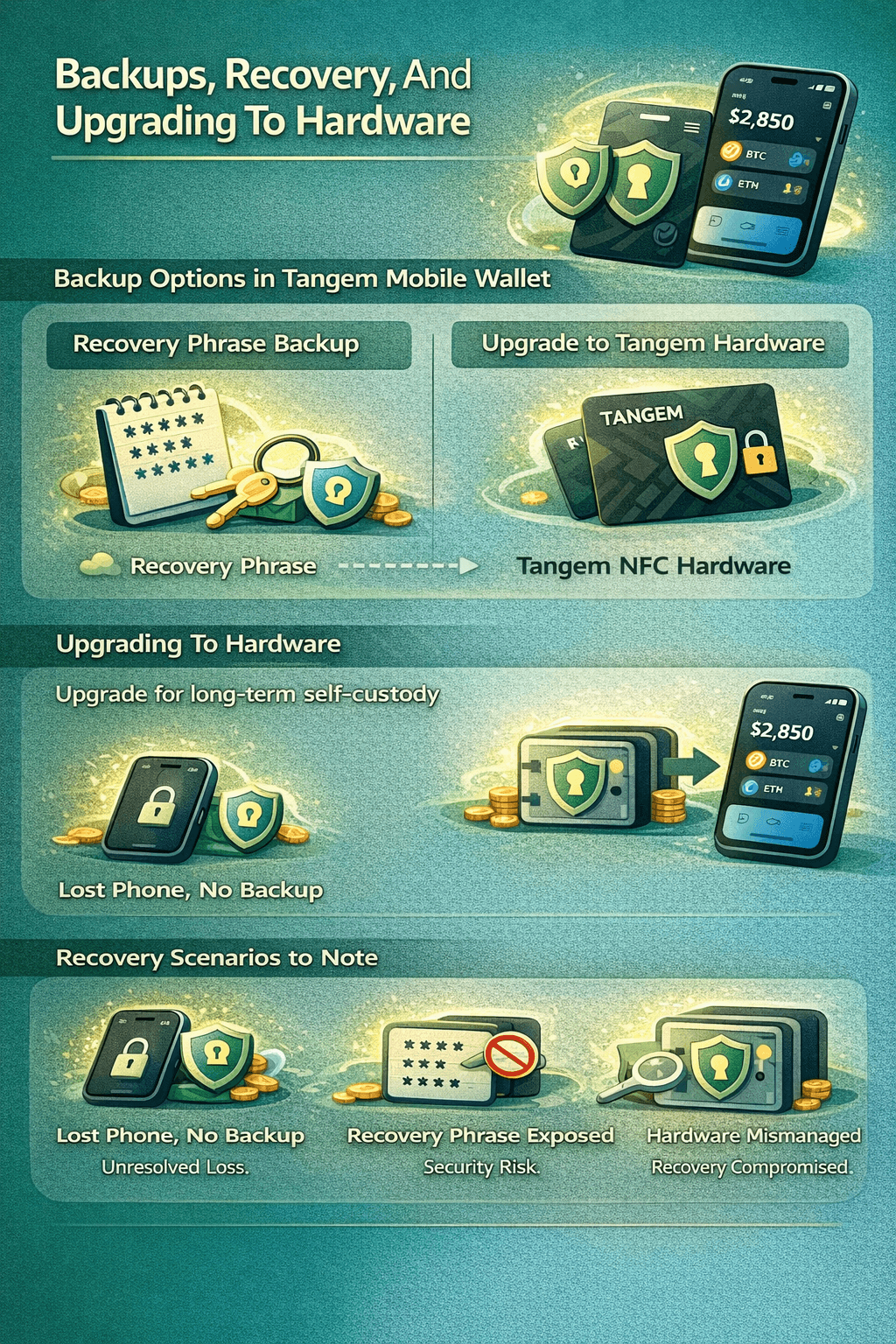 Recovery: Hardware supports multi-device backup via Tangem’s wallet setup model; Mobile Wallet recovery depends on completing backup (phrase or upgrade).