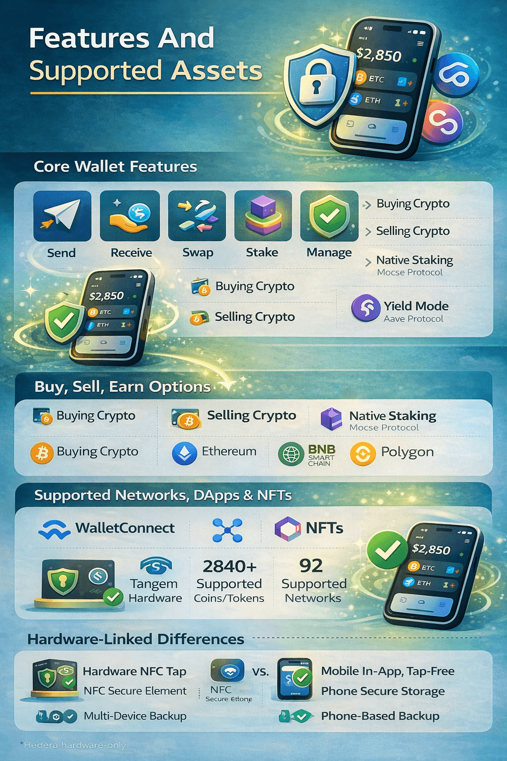 Support Differences: Some assets can differ by wallet type (example: Hedera is hardware-only).