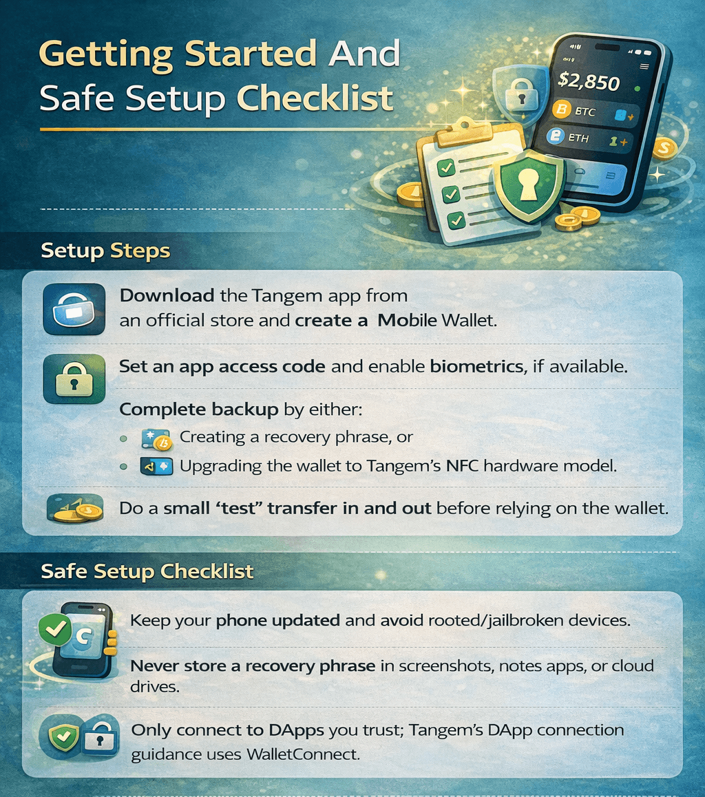 Complete Backup Before Storing Meaningful Funds: Tangem notes a quick-start Mobile Wallet is not backed up by default until you complete backup (recovery phrase or upgrade to hardware).