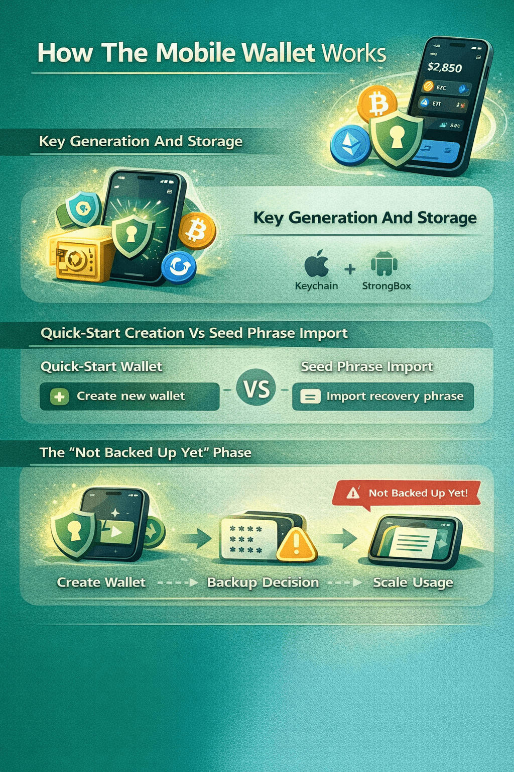 “Create Wallet → Backup Decision → Safe To Scale Usage.”
