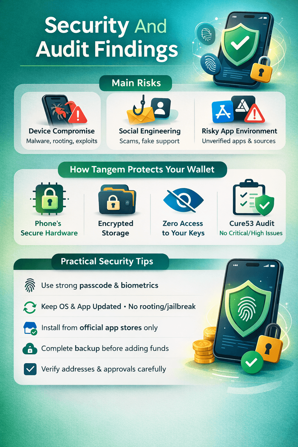 Mobile wallets live on general-purpose, internet-connected devices, so security is a mix of wallet design, device hygiene and personal awareness. Tangem’s Mobile Wallet is built to rely on the protections your phone already provides, but it’s still important to understand what those protections cover, and what they don’t.